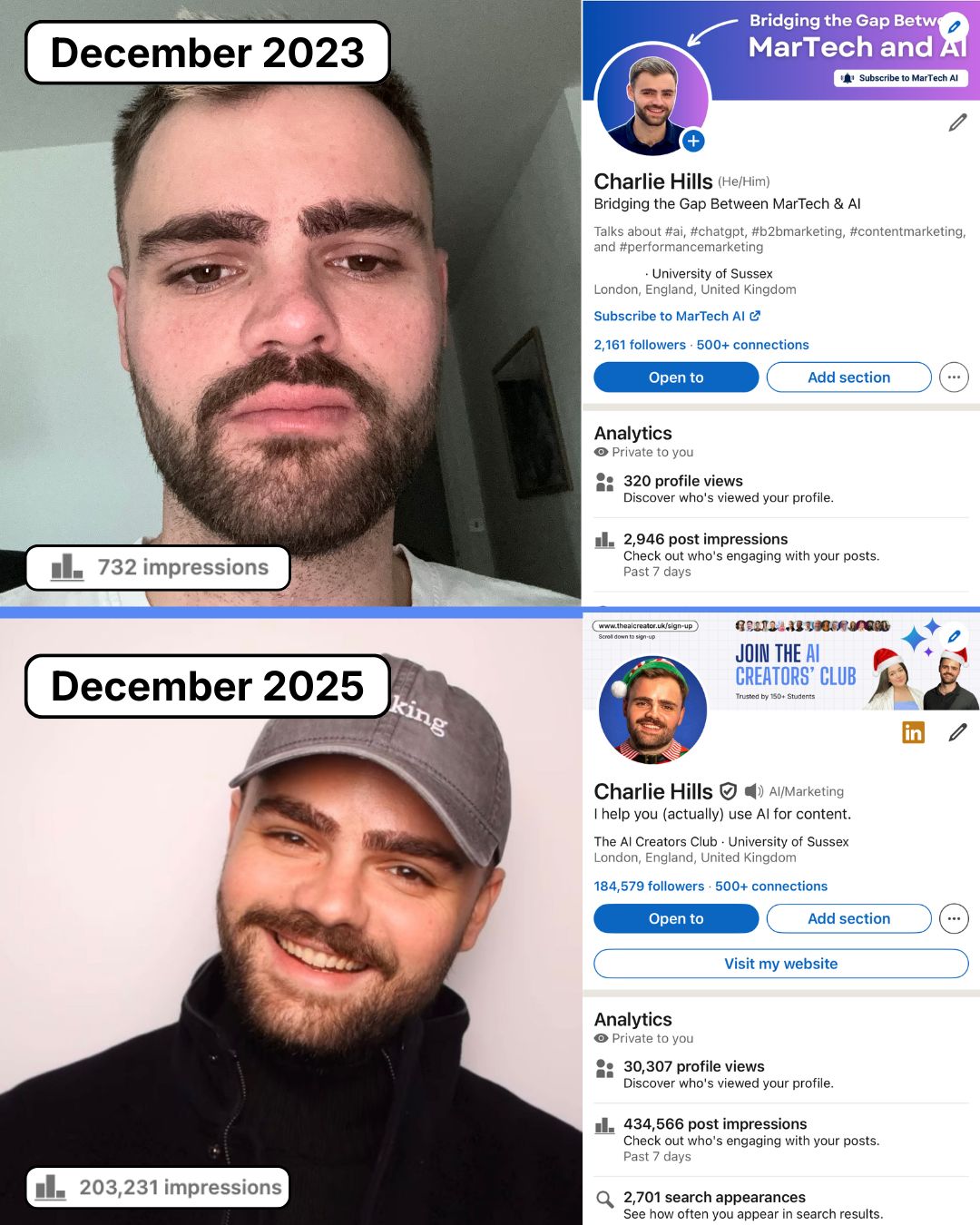 | Charlie | Systems + experiments | Practical AI content outcomes | Over-posting fatigue (he manages it with structure) |