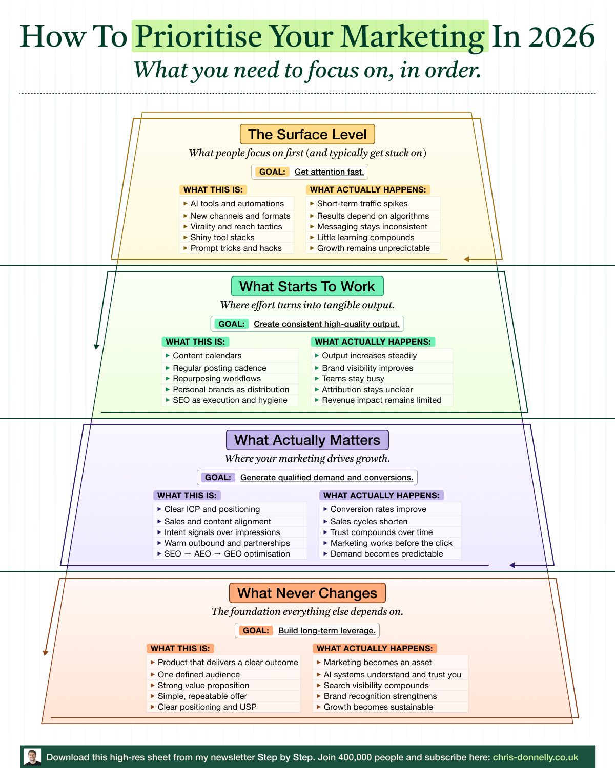 I want to expand on what Chris is pointing to, because it explains why so many teams feel busy but stuck. They keep rotating channels, tools, formats, and tactics, but the engine underneath never gets tuned. Chris laid out a simple hierarchy (from surface-level tactics down to the foundation). If you adopt it, your marketing becomes less of a slot machine and more of a system.