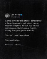 That last line is the one most people skip past. We all want the version of growth that looks clean: smart plan, perfect execution, instant validation. Jon is pointing to the opposite. Momentum is usually built through unglamorous repetition, public imperfection, and enough patience to let the boring parts compound.