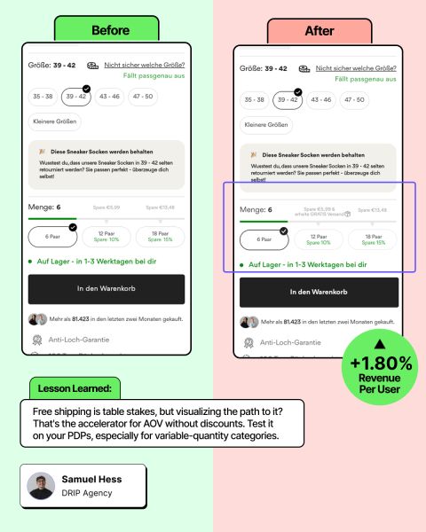 Samuel Hess recently shared something that caught my attention: "A subtle nudge on the quantity selector = +1.80% ARPU lift on women's product pages." He went on to explain that they "added a progress bar indicator showing how bumping up quantity unlocks free shipping right on the PDP." That simple line is a masterclass in modern CRO: take an incentive shoppers already care about (free shipping) and make the path to it unmistakably clear.