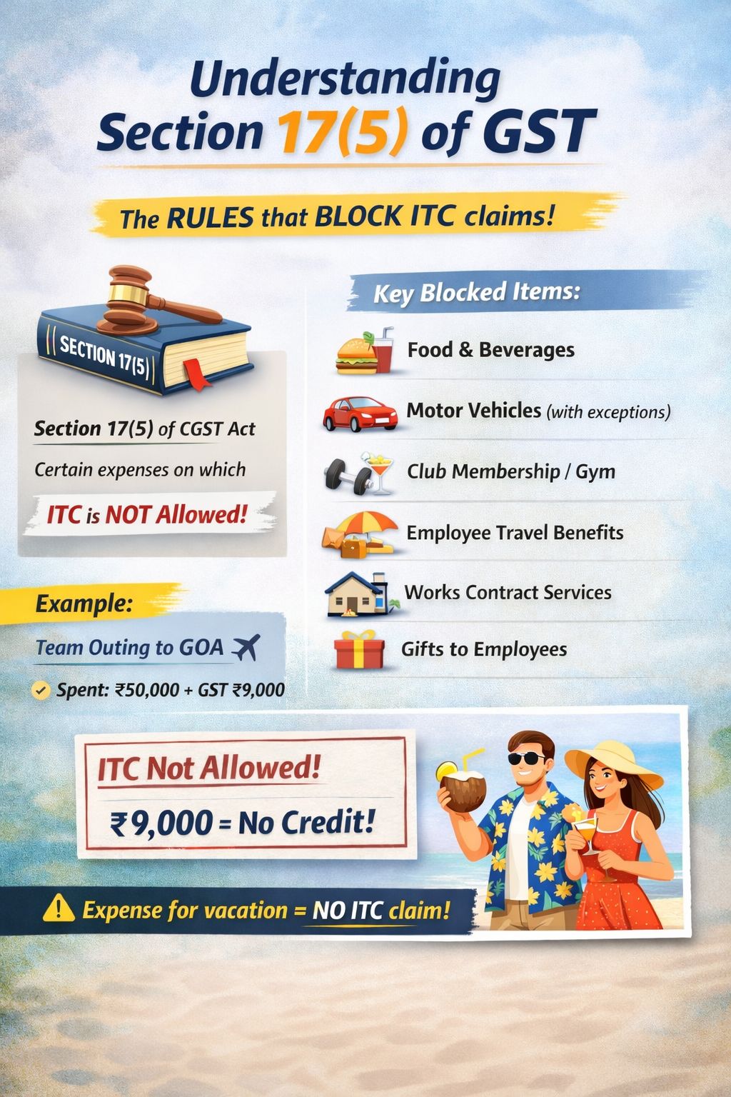💥 Section 17(5) of GST – The Most Ignored Rule! Most people think: 👉 “GST paid = ITC claim” ❌ But Section 17(5) says NO! 📌 What is Section 17(5)? It defines Blocked ITC — 👉 Expenses where ITC…