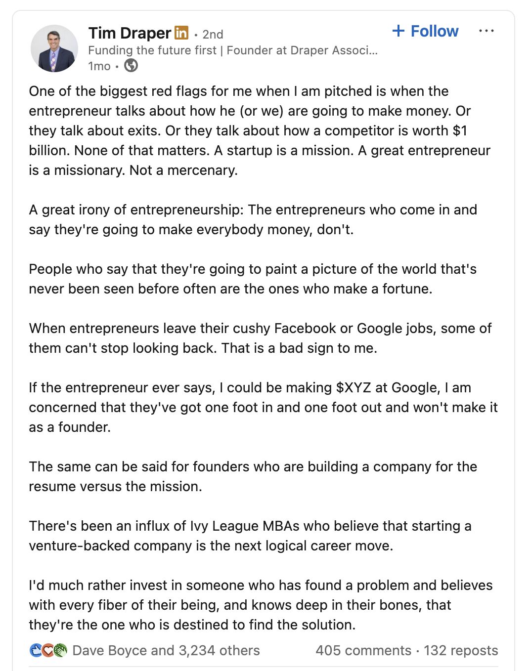 MESSAGE TO FOUNDERS: You are not allowed to want to make money. In tech, only the VC’s are allowed to desire money, set up funds whose only purpose is to make money, and get incredibly rich at the e…