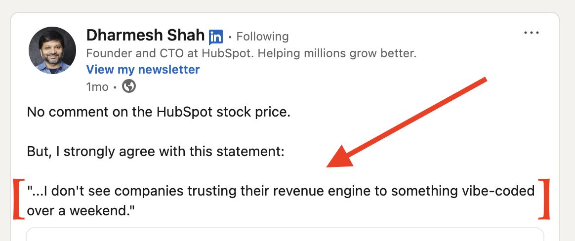 Dharmesh (Founder + CTO of Hubspot) is right — nobody's going to vibe code Hubspot. Want to know why SaaS stocks are getting smoked? I’ll tell you why. It’s not that Lovable (or any other company) w…