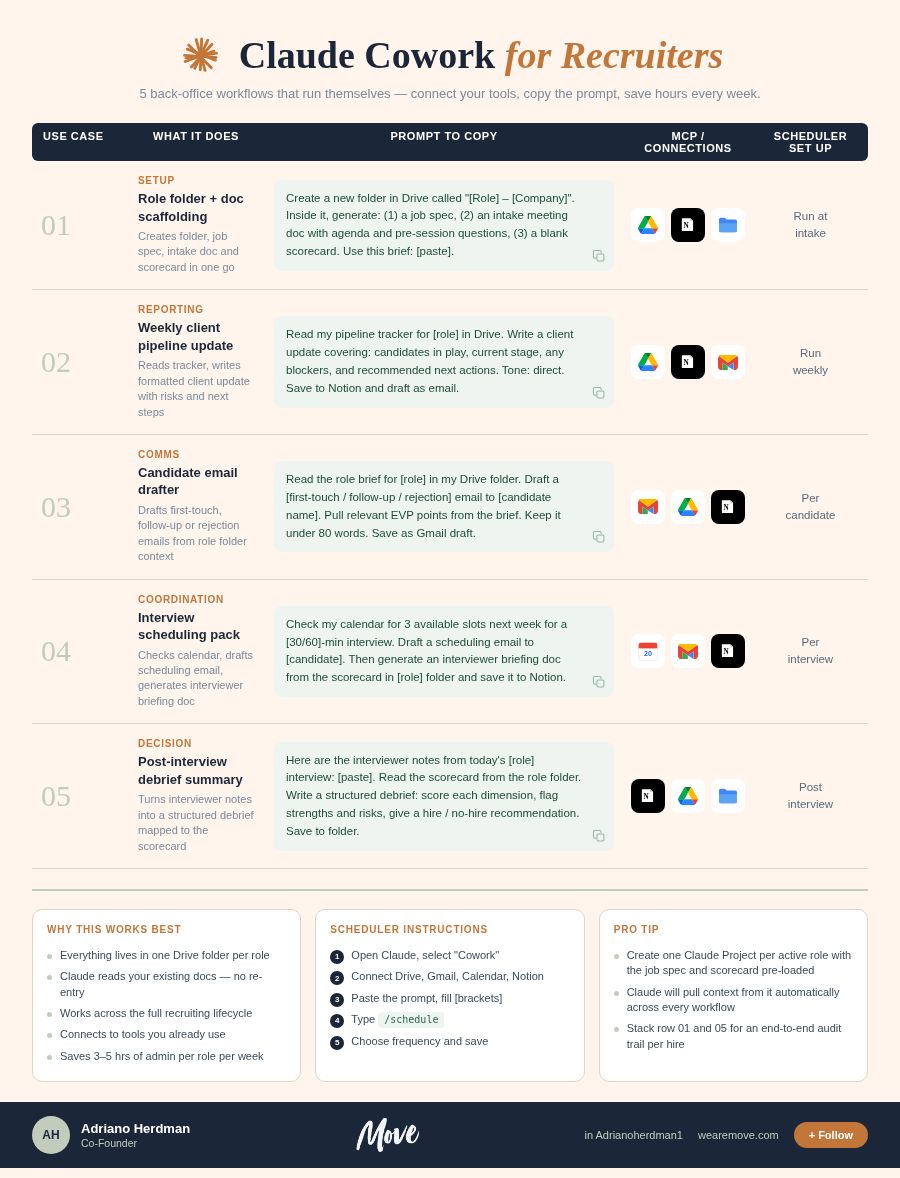🎁 Claude Cowork playbooks for recruiters. Still building role folders, sharimng pipeline updates, and drafting candidate emails manually? Here are 5 ready-to-use Claude Cowork playbooks for recruit…