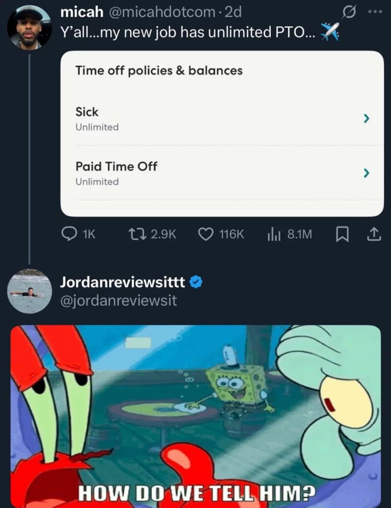 One of the biggest scams in the tech industry is "unlimited" or "flexible" PTO. Try starting at one of these companies and asking for 1 year off. What this really means is that the company wants to s…