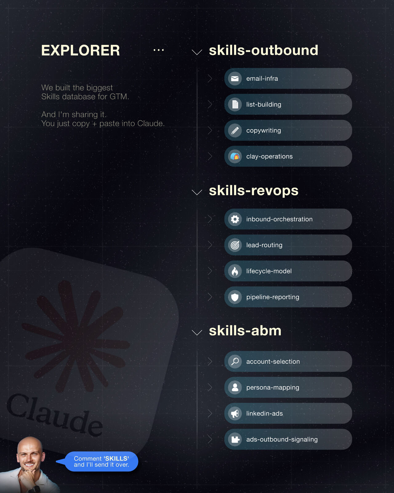 My team didn't want me to give this away for free. We built the biggest Skills database for GTM. And I'm sharing it. You just copy + paste into Claude. Outbound • email-infra – checks deliverabili…