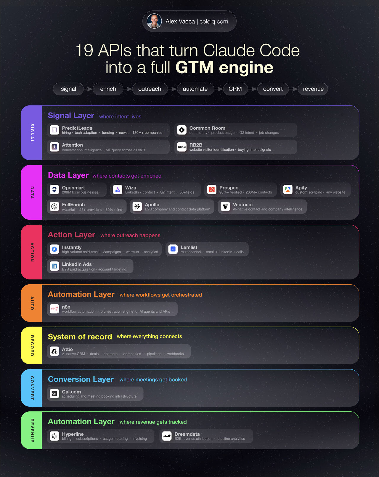 Claude Code can connect your entire GTM stack. Most teams are running 10+ tools that don't talk to each other. Here are the 19 APIs worth connecting: 1️⃣ Signal layer PredictLeads- tracks hiring su…
