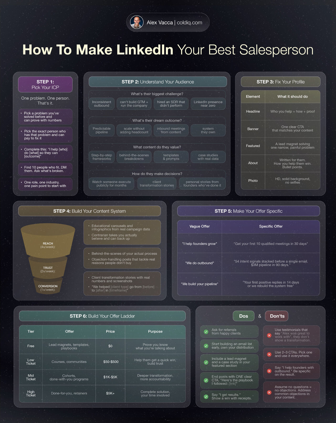 After 3 years of scaling ColdIQ to a $7M business, this is everything we learned about getting clients from LinkedIn. 1️⃣ Pick Your ICP One problem. One person. That's it. • Pick a problem you've s…