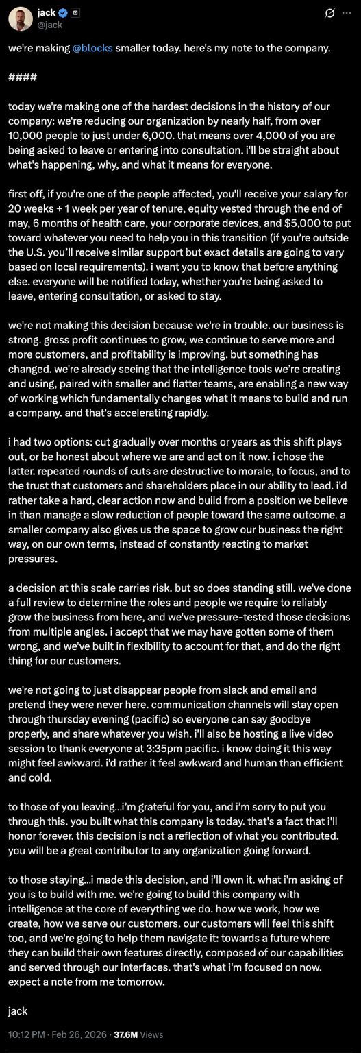 4,000 people laid off today at Block "because of AI". Announced less than 12 hours ago by Jack Dorsey on X. "we're not making this decision because we're in trouble. our business is strong. gross p…