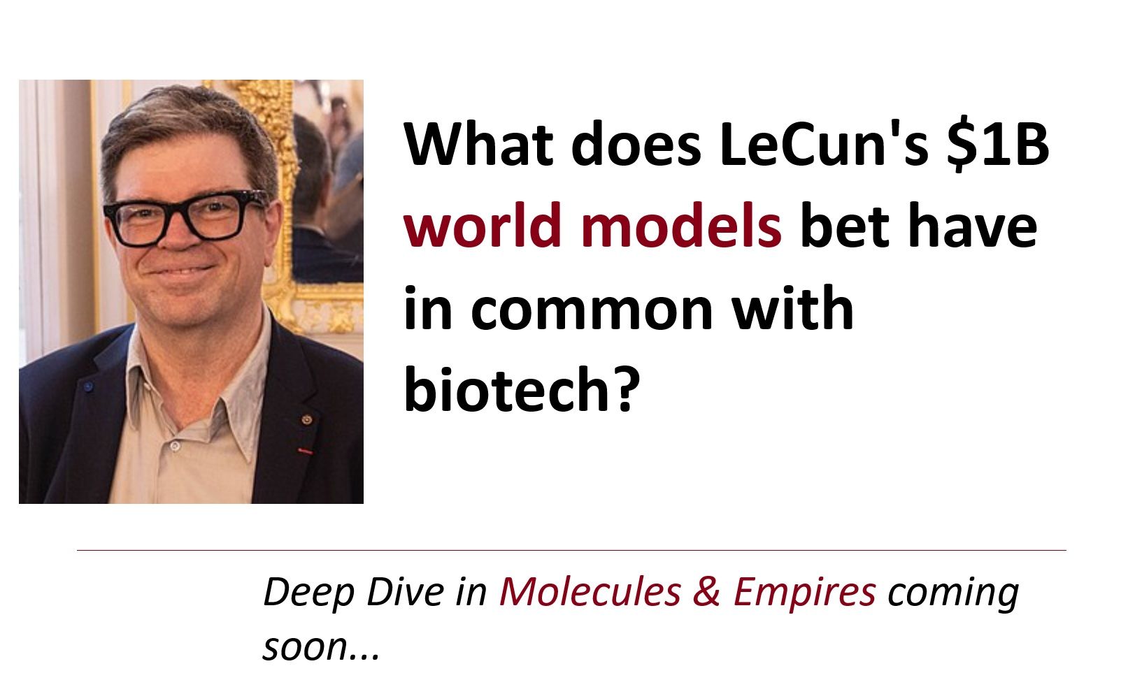 What does Yann LeCun's new $1B venture to build world models have in common with biotech? More than you'd think, and the connection reveals something important about where AI is actually heading. Le…