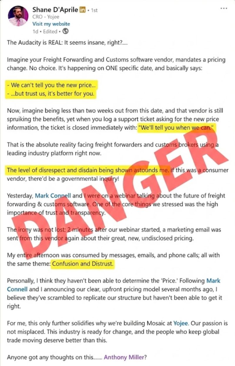 If I were handling CargoWise's new commercial model rollout (fiasco), I'd be embarrassed. 💲150% cost increase 💸35k/month increase with 3 days notice 🤖 Mandatory automation fee on invoices with no…