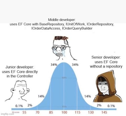 Junior developer uses EF Core directly in Controller. Middle developer uses BaseRepository, IUnitOfWork, IOrderRepository, IOrderDataAccess, IOrderQueryBuilder. Senior developer uses EF Core without…