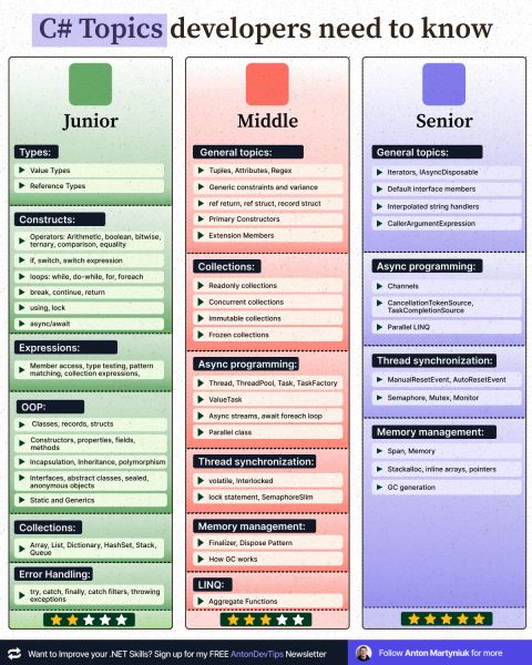 Junior developer needs to know 60 topics on C# Middle dev needs to know 46 topics Senior developer needs to know 20 topics 👉 𝗝𝘂𝗻𝗶𝗼𝗿 𝗗𝗲𝘃𝗲𝗹𝗼𝗽𝗲𝗿 1️⃣ Types: - Value Types - Reference T…