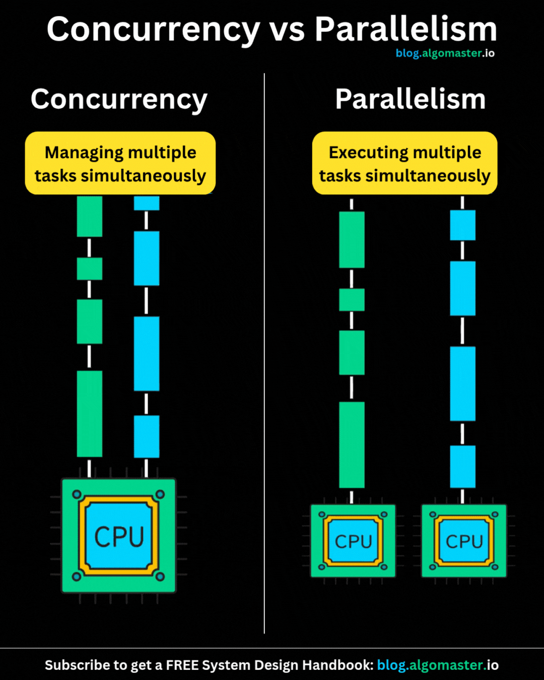 Concurrency vs Parallelism - They are NOT the same. 🔹 𝐂𝐨𝐧𝐜𝐮𝐫𝐫𝐞𝐧𝐜𝐲 Concurrency means an application is making progress on multiple tasks at the same time. While a single CPU core can hand…