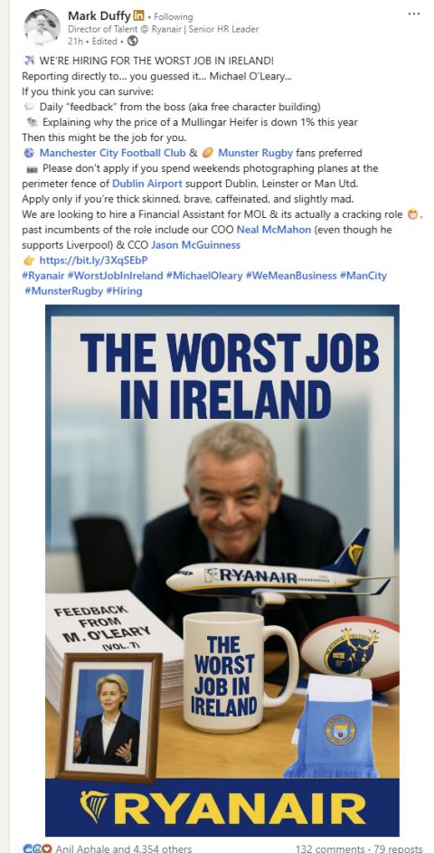 When your employer brand can laugh at itself, you’re already miles ahead. Reverse psychology at its best. Genius post Mark Duffy - link to original post in comment below. #Hiring #EmployerBranding…