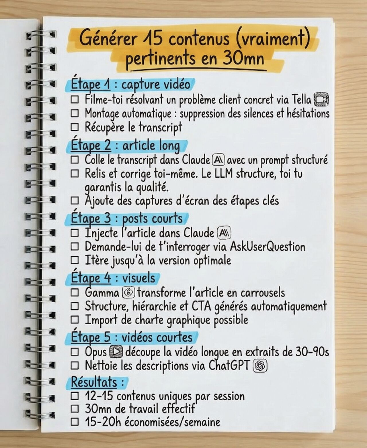 Cette méthode = 15 à 20h/semaine économisées. Étape 1 : -> Transformer ton expertise en vidéo Choisis un problème concret que tu résous pour tes clients. Filme ton écran pendant que tu le résous, e…