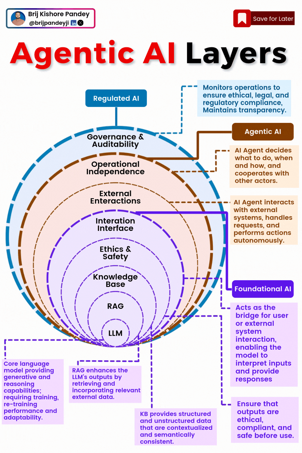 Real Agentic AI is a layered system — and each layer solves a different class of problems (accuracy, safety, autonomy, compliance, operations). Here’s a clean way to visualize it 👇 Agentic AI Layer…