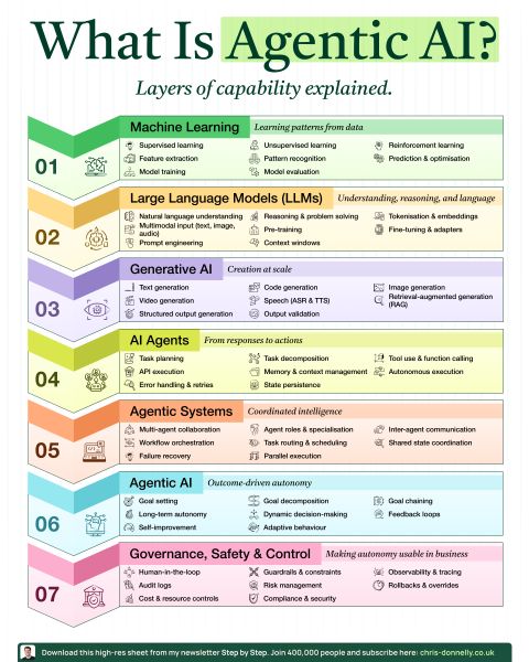 Agentic AI is not “ChatGPT with extra steps.” Here's how to explain it to your leadership team: ChatGPT can perform complex tasks. But Agentic AI is an elevated experience. Here are the 7 laye…