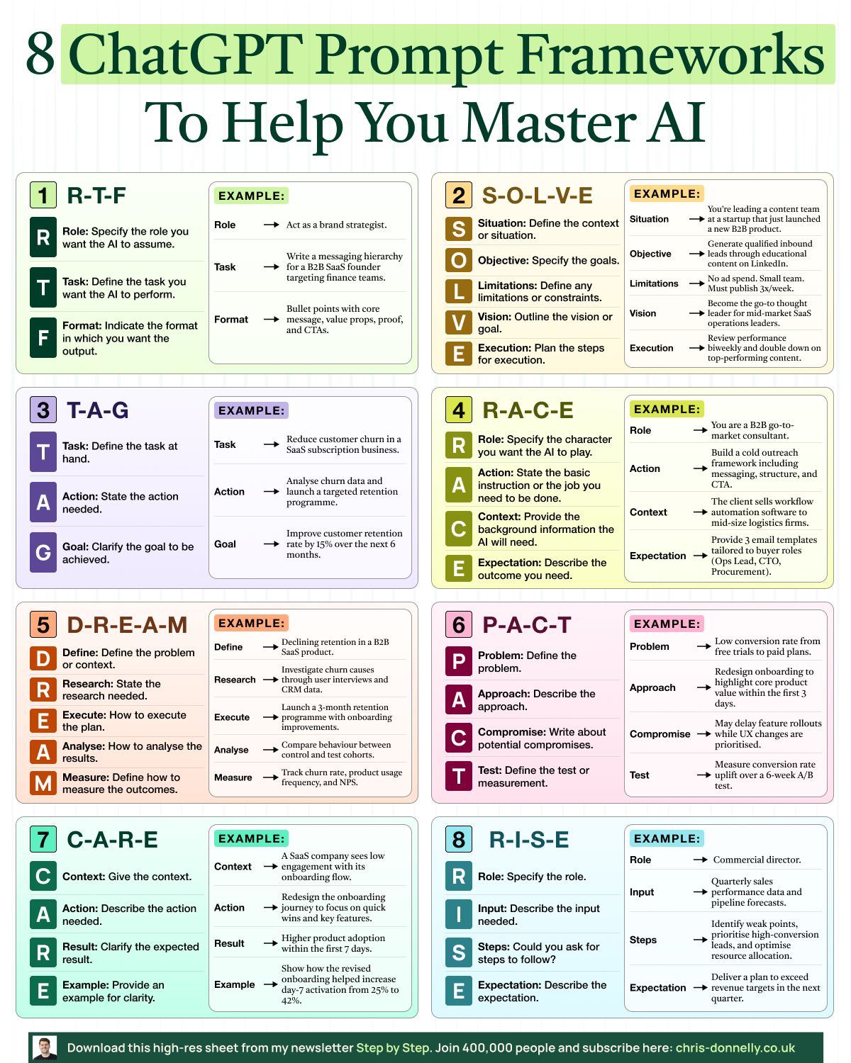 Don’t be the person who gets caught producing terrible AI output. Instead, steal 1 of these 8 frameworks: This is where you should start with AI: Mastering the art of prompting. Prompting basic q…