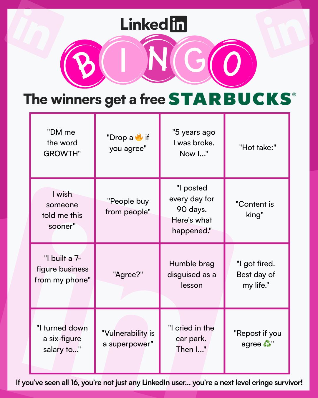 It’s time for… LinkedIn Bingo Winners get a free Starbucks ☕ How to play... Read the Bingo card. Comment and tell me how many you’ve seen. If you’ve seen all 16, you get a free Starbucks First 15 get…