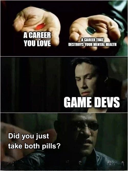 This meme hits right in the core. #GameDev is probably the only industry where you don’t choose between the two pills – you just take both. You love what you do. And at the same time, deadlines, mil…