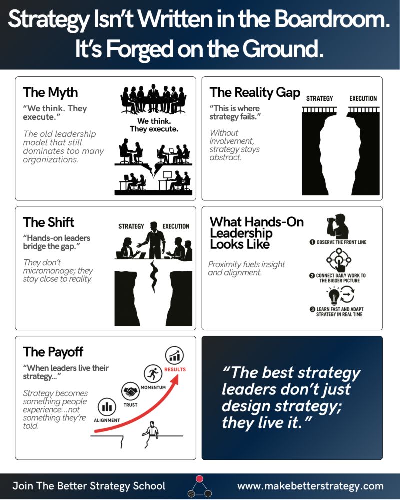 Strategy isn’t written in a boardroom — it’s forged on the ground. Leadership isn’t only about setting the strategy. It’s about living it. Every single day. Might sound obvious. But too many leader…