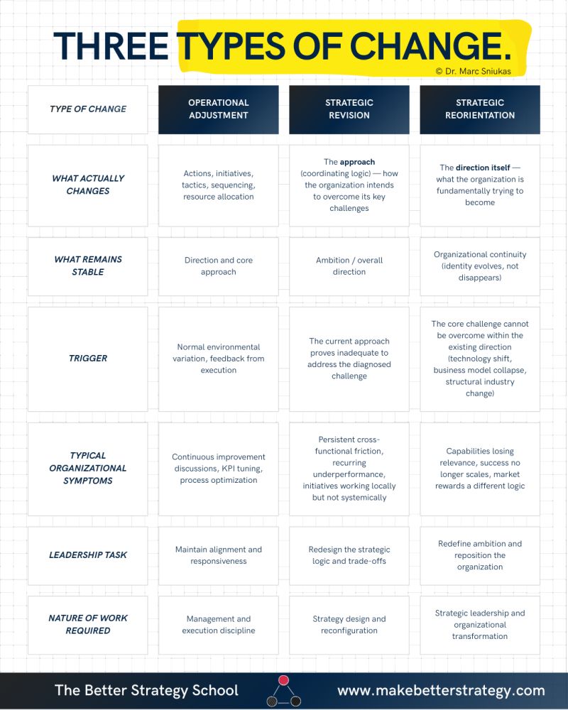 Most organizations confuse changing direction with changing course. They are not the same thing. In practice, strategy involves three distinct types of movement — and conflating them is one of the m…