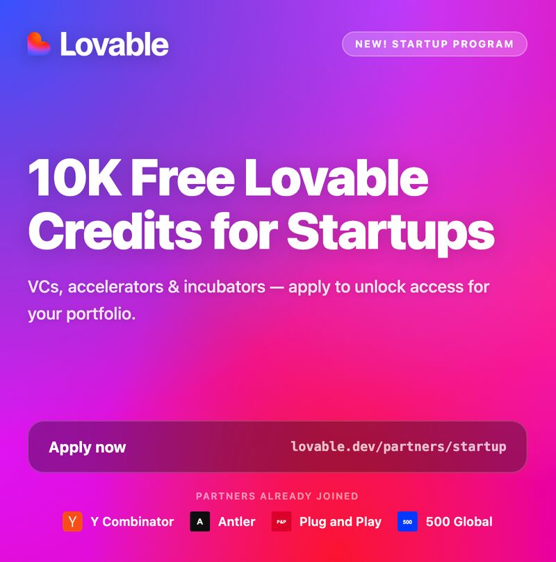 We’ve launched a startup program at Lovable! Qualifying startups get 10K in Lovable credits if their VC, incubator, or accelerator partners with us. Startups, if your roadmap currently starts with “o…