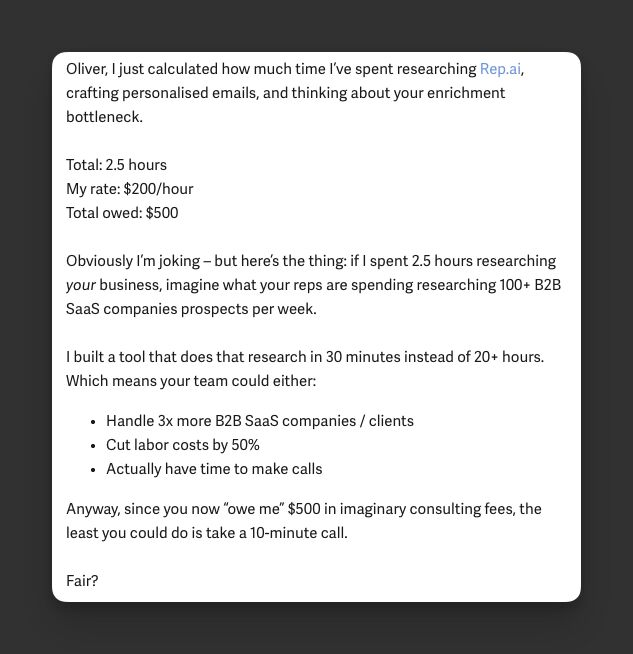Oliver got a cold email claiming "2.5h of research." But it showed 0 actual research. This is the trust gap destroying outbound in 2025. 𝗧𝗵𝗲 𝗣𝗿𝗼𝗯𝗹𝗲𝗺: When the tactic is "trick you with f…