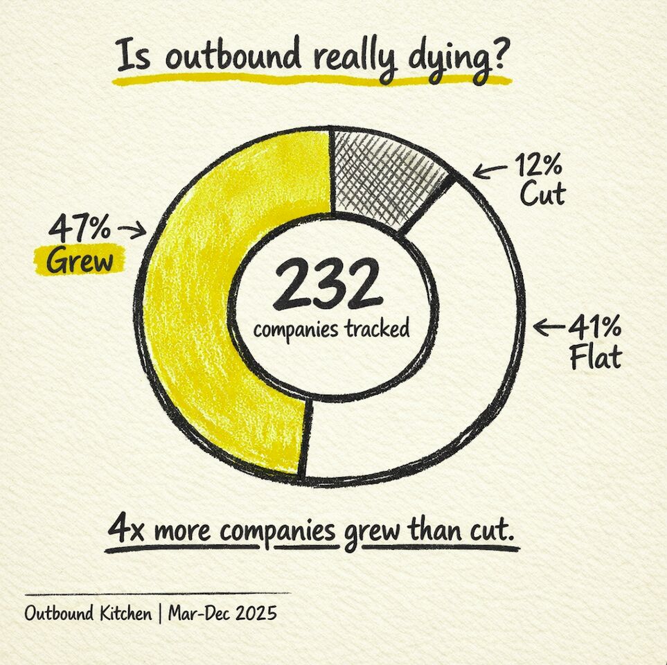 If you only read LinkedIn, you'd think outbound is dead. AI is replacing SDRs. Cold calling is dead. Email is dead. I tracked 232 companies starting in March 2025. I looked at global SDR headcount…