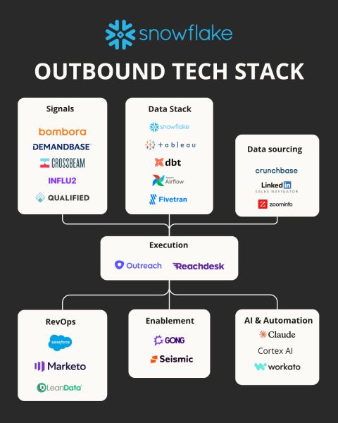 Snowflake crossed $4.47B ARR. Here’s the outbound tech stack behind their growth, supporting 300 SDRs, broken down by function ⬇️ 1) Signals Spot accounts showing intent, engagement, or inbound bu…