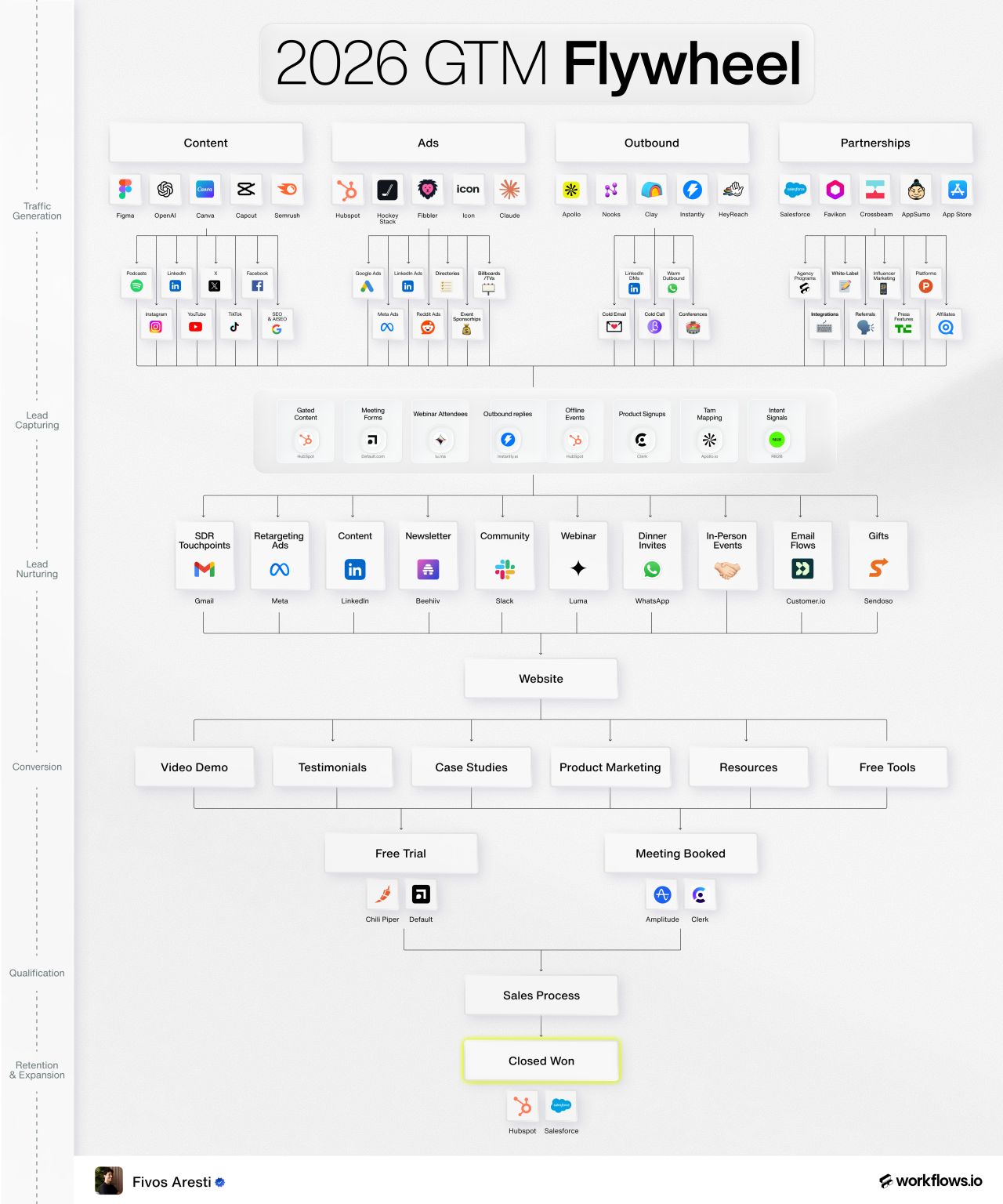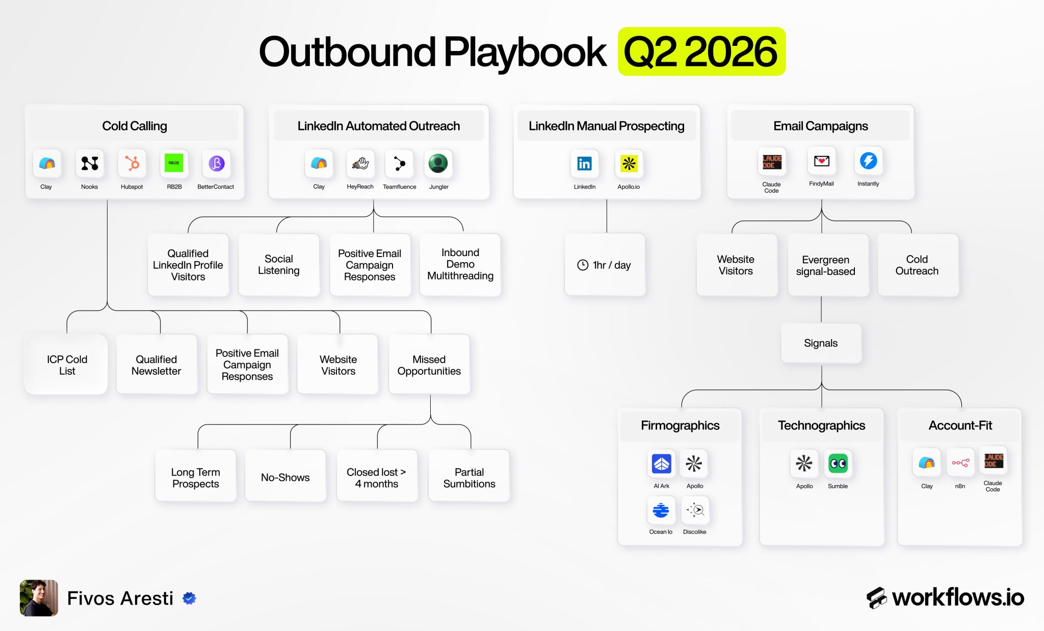 Fivos Aresti positions himself as a technical GTM architect who bridges the gap between high-level growth strategy and granular AI implementation. His content strategy centers on the "2026 GTM Flywheel," a recurring framework where he deconstructs complex outbound systems into repeatable, tool-heavy playbooks. He is notable for his radical transparency regarding his internal tech stack, frequently listing the exact sequence of MCPs, LLMs, and data orchestrators like Clay and Claude Code that power his own 20-person agency. This intersection of founder-led transparency and engineering-grade automation makes his work essential for modern sales leaders looking to move beyond basic sequences into sophisticated, signal-based orchestration.
