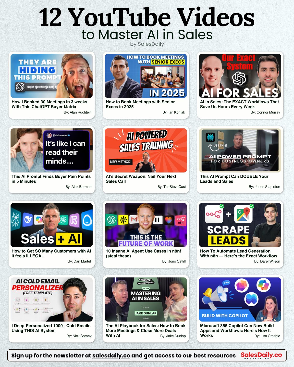 12 YouTube Videos to Master AI in Sales Stop following AI hype. Watch what real sellers are doing instead. (Curated by SalesDaily.co) ⇢ FREE: Top 50 Sales Cheat Sheets: https://lnkd.in/eha4zpHe…