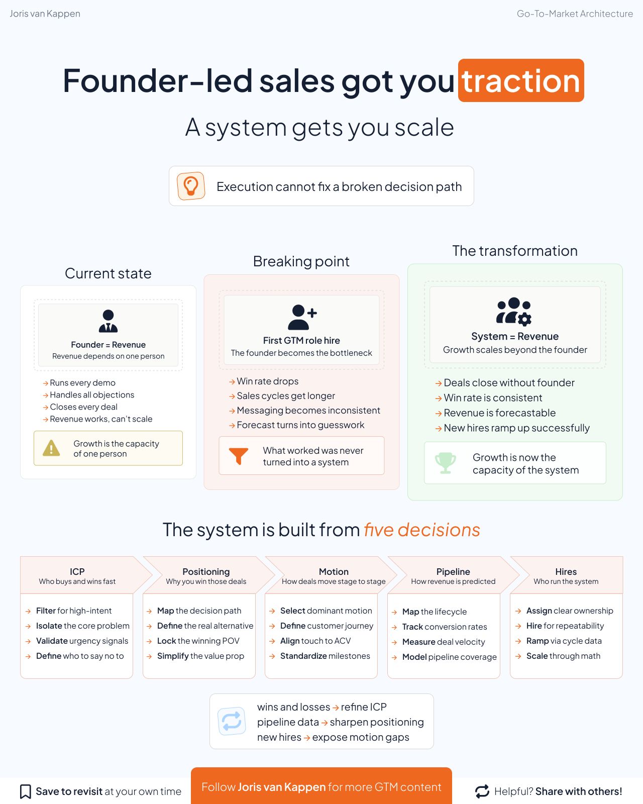 Founder-led sales got you traction. It’s also what will cap your growth. The breaking point is predictable: You hire your first AE or Head of Sales. And suddenly: → win rate drops → deals slow down…