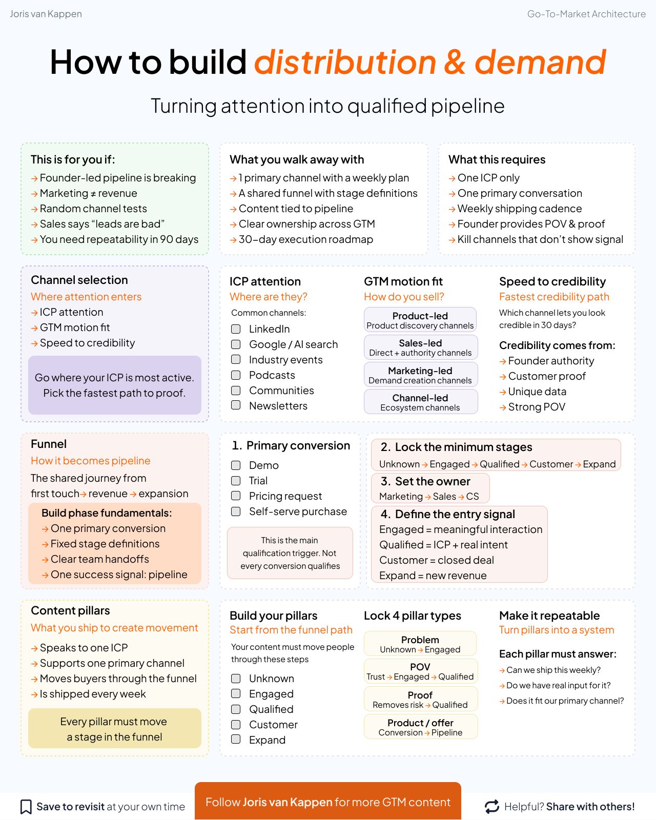 Joris van Kappen positions himself as a high-level GTM architect for B2B SaaS founders, moving beyond generic growth advice to focus on the structural integrity of a company’s revenue engine. His strategy centers on motion design, where he deconstructs complex scaling hurdles into repeatable systems—specifically targeting the "breakpoints" in pricing, demand creation, and messaging hierarchy. What makes Joris notable is his refusal to equate activity with progress; he advocates for repeatability through constraints, often pushing founders to "kill what doesn’t show signal" in favor of a singular, shared funnel. His work represents a sophisticated intersection of strategic consulting and operational transparency, using frameworks like the Van Westendorp model to transform subjective founder opinions into objective, scalable market motions.