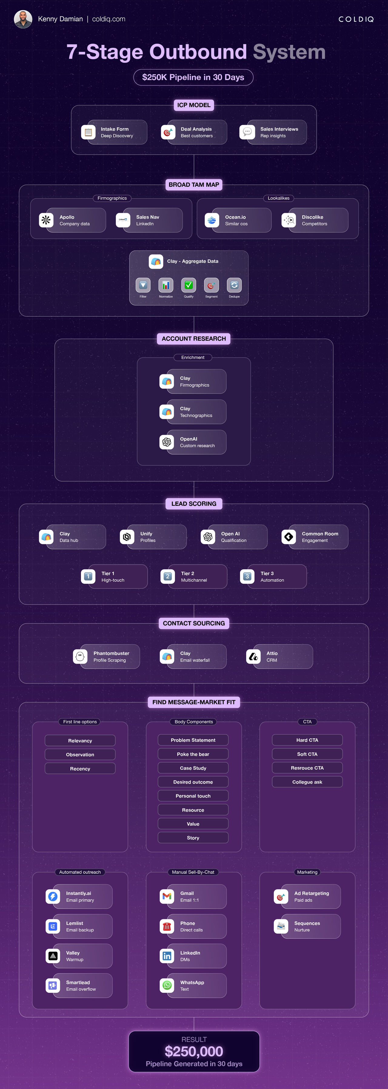 This outbound system printed $250,000 in pipeline in 30 days. Here’s the 7-stage playbook behind it. 1️⃣ ICP FOUNDATION We start with proof, not guesses. → Deep intake form → Reverse-engineer th…