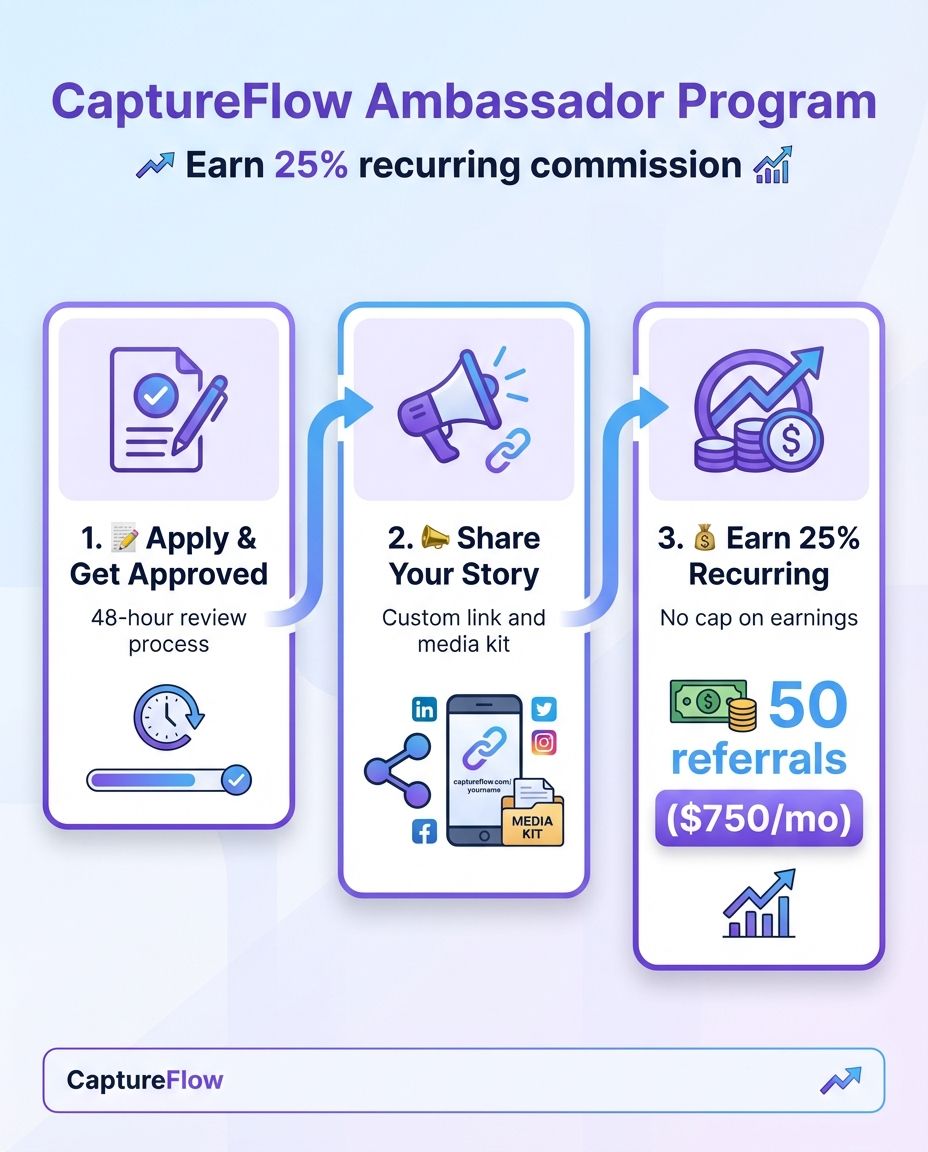 We just allowed one person to joined the CaptureFlow Ambassador Program today. Here's the model: 25% recurring commission on every subscription you refer. Not a one-time payout. Every month, as lon…
