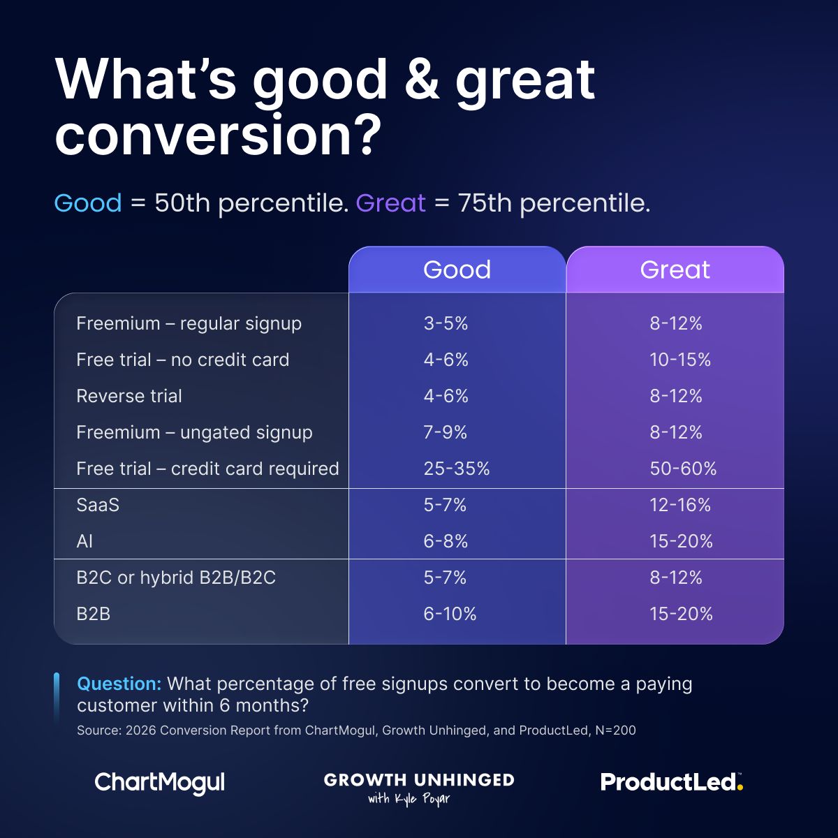 What is good & great free-to-paid conversion, 2026 edition 👇 I partnered with ChartMogul and ProductLed to look at new data from 200 self-serve products. Here's what we found: 1. Freemium -- think:…