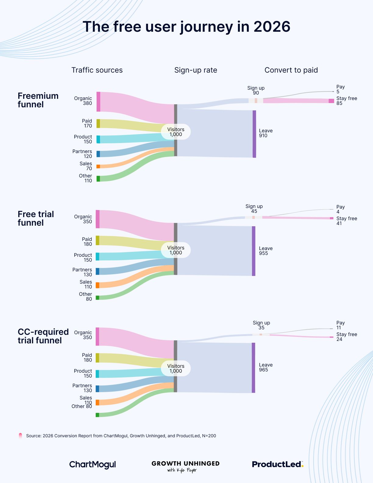 New: SaaS & AI funnel metrics for 2026 👀 The FREEMIUM funnel with 1,000 website visitors: 📈 Traffic: 380 come from organic sources, 170 from paid marketing & 150 are product-generated (referrals,…