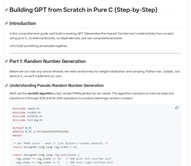 This guy built GPT from scratch in pure C. No PyTorch. No TensorFlow. No libraries. Just raw C code. What he implemented: → Custom random number generator (xorshift) → Character-level tokenizer → M…