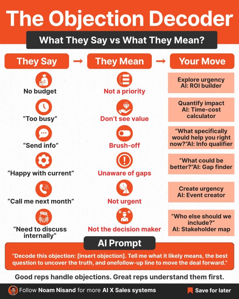 You don’t lose deals because of objections. You lose them because you misread what they mean. Most “No budget” or “Too busy” is just a translation problem. This decoder breaks down what prospects r…