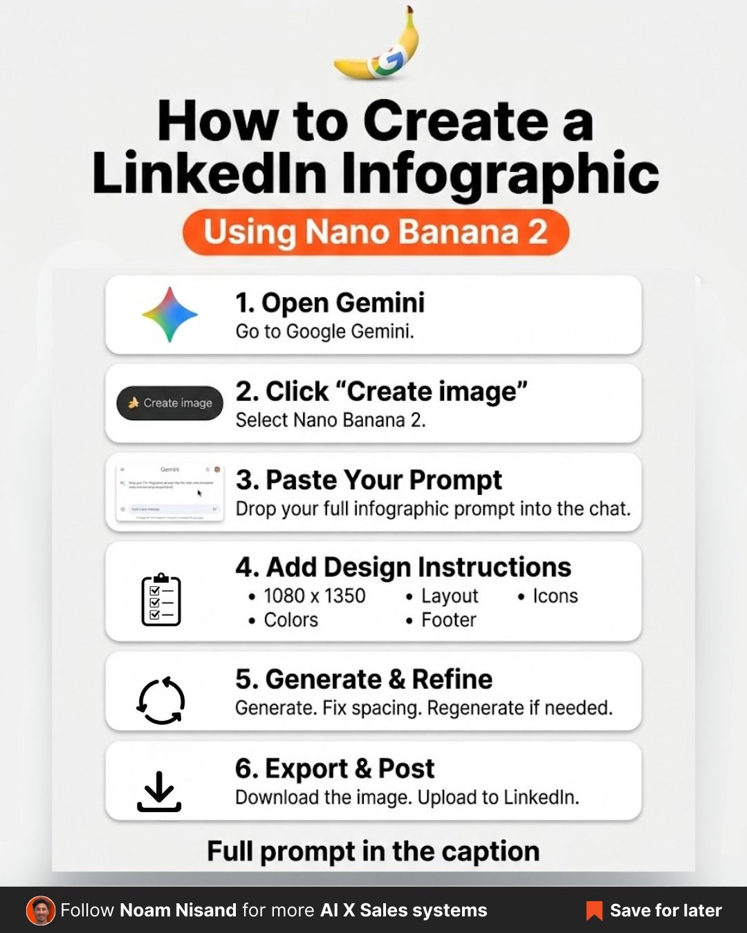 Nano Banana 2 just dropped, and it’s insane. Use this prompt to create infographics like the one you see here: ”Create a 1080 x 1350 vertical LinkedIn infographic. Style: - Light grey background -…