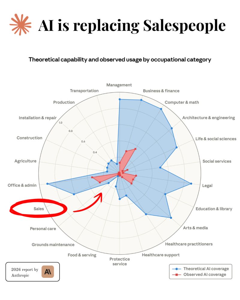 Stop thinking “sales is a safe job.” Anthropic's 2026 report just proved you wrong. It shows AI is already theoretically capable of covering most sales tasks, companies are just slow to adopt. Tha…