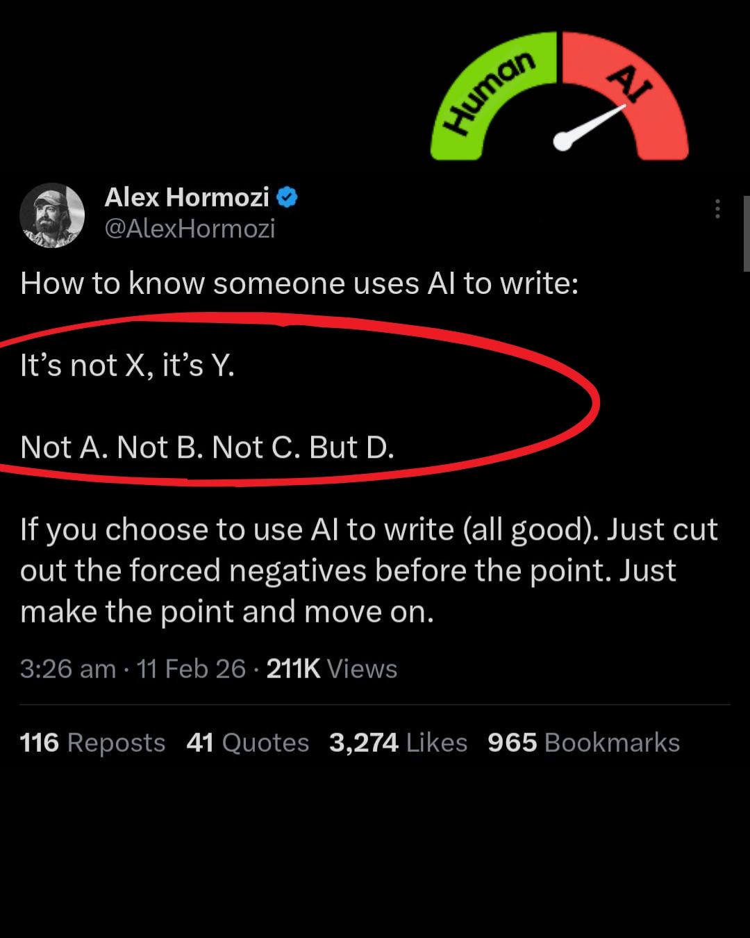 53.7% of your LinkedIn feed is AI-written, and you can tell. If you’re going to use AI, at least make it sound like you. The Humanizer Prompt: (brutal version) ”Rewrite the text below like it was w…