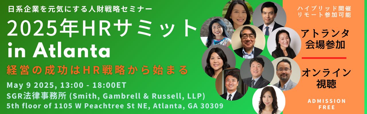 【2025年HRサミット開催のお知らせ】 『経営の成功はHR戦略から始まる』 2025年、トランプ政権の誕生によりアメリカの政治・経済情勢は再び大きな転換期を迎えています。人手不足や高賃金の課題が続くなか、「HR(人的資本)」はもはや経営の周辺領域ではなく、中核そのものです。 今回のサミットでは、米国で活躍する9社のHR・経営プロフェッショナルが登壇し、日系企業がこの環境をどう乗り越え、チャン…