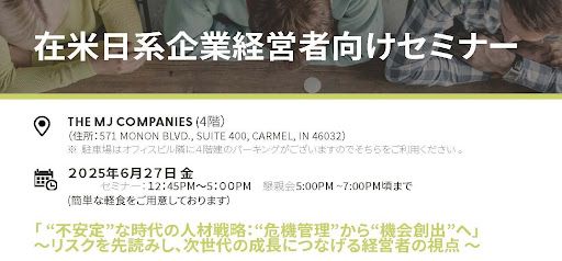 在米日系企業の経営者の皆様、 6月27日(金)にインディアナポリスで行われるセミナーのご案内です。 「“不安定”な時代の人材戦略:“危機管理”から“機会創出”へ」 をテーマに、私モーガンのぞみを含めた専門家が、実践的な戦略や最新事例をご紹介します 。 また、同じ課題に取り組む経営者の皆様との貴重なネットワーキングの機会もございます 。 是非ご活用ください。 イベント:「“不安定”な時代の人材…