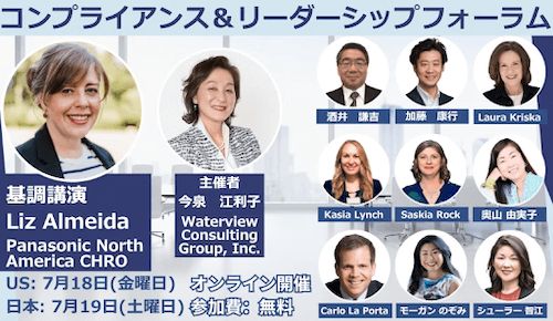 📢 第2回「コンプライアンス&リーダーシップフォーラム」開催のお知らせ 2025年7月18日(金)に、Waterview Consulting Groupの主催で、第2回「コンプライアンス&リーダーシップフォーラム」が開催されます。 今後ますます競争が激化するアメリカ市場で勝ち抜くために、日系企業が現在の人材開発における課題にすぐに対処できるよう、様々な題材を集めた内容となっています。弊社か…