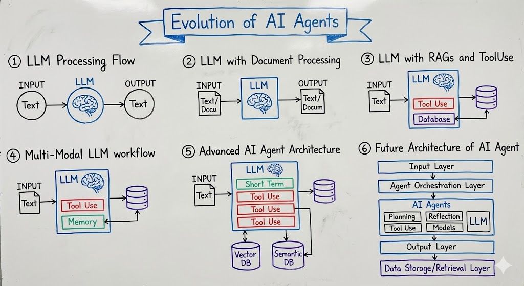 I've spent 2000+ hours learning and building AI Agents Here's how AI Agents evolved over time 👇 Phase 1: The Foundation - Basic LLM - Simple workflow: Input (Text) → LLM → Output (Text) - Transfor…