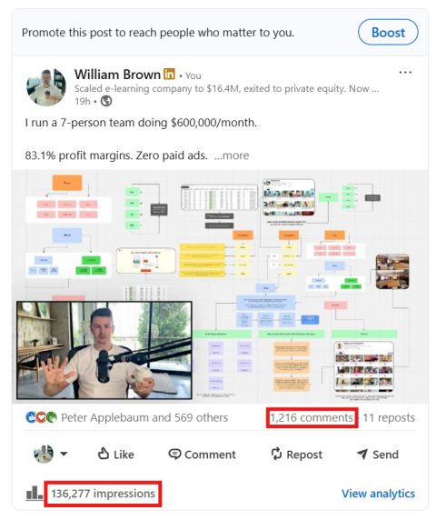 "The LinkedIn algorithm is so bad right now" But this post I wrote for William Brown yesterday, generated: - 569 likes - 1,216 comments - Over 130,000 impressions If you've posted on LinkedIn in the…