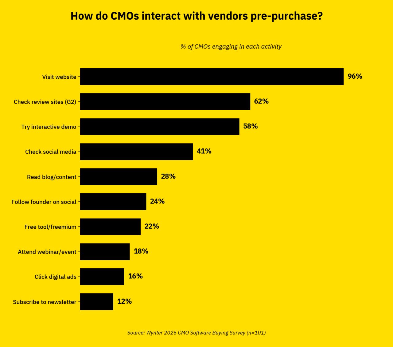We have hard data: your website is still your most important marketing asset. We asked 101 B2B SaaS CMOs how they interact with vendors pre-purchase. 96% of the CMOs will visit your website (if you…